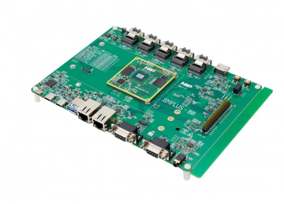 以下は、NXPが提供するi.MX 8M Plus評価キット「8MPLUSLPD4-EVK」の写真です。「SSOM-i.MX8MP-CHINCHILLA」のキャリアボードも同様の信号マッピングと配置を採用しています。ただし、SoM部分が小型化されているため、SoMとキャリアボード間のコネクタは異なります。