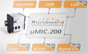 自由にプログラム可能なLinuxベースの制御ユニットuMIC.200には、最大1 GHzでクロックされるARMコントローラが装備されています。このモジュールは、512 MBのRAMとmicroSDスロットを介して拡張可能な4 GBのフラッシュメモリを提供します。モジュールの最大消費電力は4ワットです。