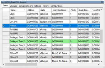 利用可能な情報は、特定のSAFERTOS(R)構成によって異なります。構成はコンパイル時に決定され、実行中に変更されません。UDEのSAFERTOSサポートウィンドウに表示される情報は、ターゲットマイクロコントローラーがHALTに入るとすぐに更新されます状態(例:ブレークポイント)、リソースとオブジェクトのタスクに関する利用可能な情報ネーム、アドレス、状態、スタック情報と使用率、優先度、イベント、ミューテックス、通知など