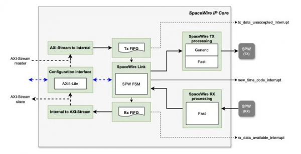 SpaceWireは、全二重双方向のシリアル通信リンクであり、各方向に2対の差動ペアを使用してデータをエンコードします。本IPコアは、CubeSatなどのナノサテライト、宇宙カメラ、オンボードコンピュータ(OBC)、および組み込みマイクロコントローラを含む多くの航空宇宙マイクロエレクトロニクスデバイスに適用可能です。特徴として、IPコアはポイントツーポイントリンクにおいてパケットレベルまで動作し、宛先アドレスを必要としません。また、完全RTL(VHDL)で設計されており、外部マイクロプロセッサやソフトウェアを必要としないため、ゲートとメモリの消費を抑えられます。
