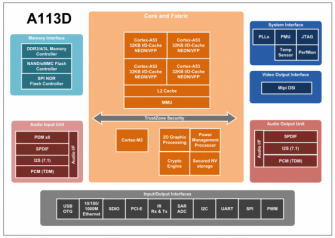 ・ A113Dは、複数のTDM、PCM、I2S、SPDIFデジタルオーディオ入出力インターフェース、8チャンネルの遠距離PDMデジタルマイク(DMIC)入力を含む、すべての標準オーディオ入出力インターフェースを統合しています。オーディオ入力には、低活性状態から起動するための電力検出器と、マルチルームオーディオアプリケーション用のハードウェアアシスト同期ブロックがあります。オーディオ入力データは、常時接続のオーディオ・プライバシーを保護するために、信頼できるメモリ領域に制限することができます。