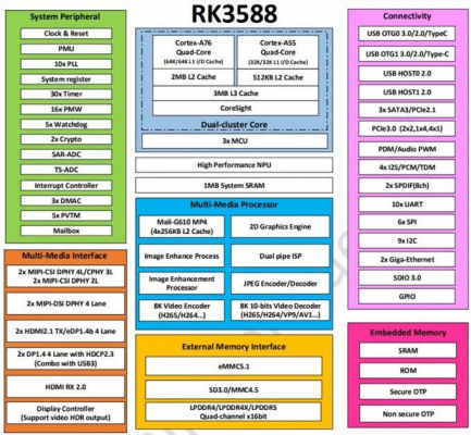 フラッグシップスマートフォンやタブレット向けの最新のハイエンドSoCは、数年前に主流のx86に使用されていたプロセッサと同等またはそれ以上のコンピューティングパフォーマンスをすでに提供しています。実際、RockchipのRK3588は、8つの汎用コア(DynamIQ構成の4つの高性能Cortex-A76と4つのエネルギー効率の高いCortex-A55)、クワッドクラスタARM Mali 'Odin' GPU、6 TOPS NPUアクセラレータ、および8Kp30ビデオエンコーディングと8Kp60ビデオデコードをサポートする高度なマルチメディアエンジンを備えた非常に強力なパフォーマンスを発揮します。。メモリに関しては、RK3588は最大32GBのDRAMをサポートする64ビット(4×16ビット)LPDDR4X / LPDDR5コントローラを備えています。パフォーマンスだけでは、幅広いx86ベースのアプリケーションや新興アプリケーションに対応するには不十分です。競争力のあるコンピュータに電力を供給するには、RK3588 SoCは従来のx86インターフェイスをサポートする必要がありますが、AR/VR機器などの新興アプリケーションでは、モバイルI/Oもサポートする必要があります。SoC は、デュアル GbE、SATA、PCIe 2.0、PCIe 3.0 x4、DisplyPort1.4、eDP、HDMI 2.1、MIPI DSI、eMMC 5.1、SDIO、および USB 2.0/3.1 インターフェイスをサポートしています。