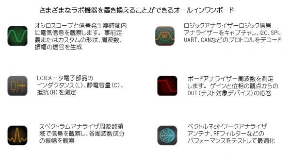 無料のオンラインアプリ(オシロスコープ&シグナルジェネレータ、スペクトル、ボードアナライザ、ロジックアナライザ、LCRメータ、ストリーミング、ネットワークマネージャ、キャリブレーションツール)、LabVIEW、MATLAB、Python、またはScilabを使用してリモートで制御可能です。
