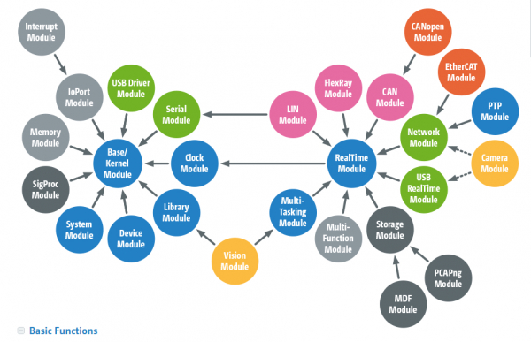 Kithara RealTime Suiteは、さまざまなモジュールで構成されています。ソフトウェアは、これらのモジュールでお客様固有の構成にすることができます。ベース/カーネルモジュールは常に必要です。この図は、モジュール間の関係を示しています。