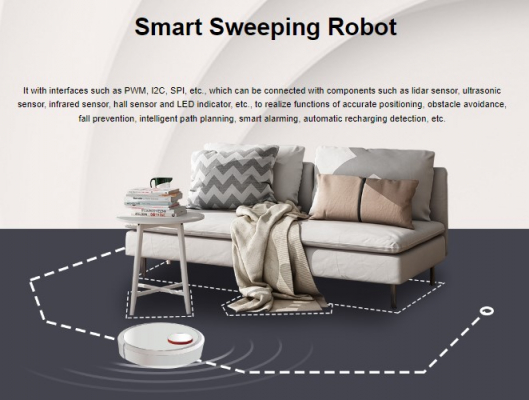 PWM、I2C、SPIなどのインターフェースを備えており、ライダーセンサー、超音波センサー、赤外線センサー、ホールセンサー、LEDインジケーターなどのコンポーネントと接続して、正確な位置決め、障害物回避、落下防止、インテリジェントな経路計画、スマート警報、自動充電検出など。