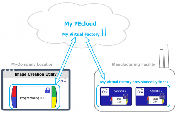 ジョブイメージは、Cycloneイメージ作成ユーティリティで作成され、PEcloudに展開され、リモートCycloneにダウンロードされます。ジョブはCycloneにロードされますが、プログラム、プログラム追跡、データ追跡、およびロギングに対するすべての権限はPEcloudに保持されます。PEcloudの仮想工場は、すべての生産が管理される場所です。