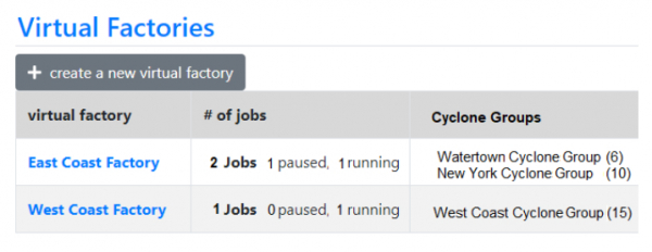 ユーザーは、必要な数の仮想ファクトリを持つことができます。彼らは好きなだけCycloneグループを持つことができます。ただし、各現実世界のCycloneは1つのCycloneグループにのみ属することができ、Cycloneグループは一度に1つの仮想ファクトリーにのみ属することができます。