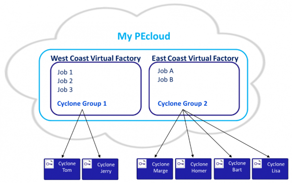 PEcloudは、ユーザーの仮想ファクトリでプロビジョニングされたCycloneにのみジョブをダウンロードできるようにすることで、別の制御レイヤーを追加します。指定された仮想ファクトリにプロビジョニングされていないCycloneにダウンロードすることはできません。