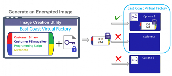 PEcloud にデプロイする場合、プログラミング ジョブはお客様が生成した暗号化キーで暗号化する必要があります。同様に、プログラミングジョブは、同じ顧客暗号化キーがプリロードされたCyclonesにのみダウンロードできます。これは、顧客のIPは、その顧客が秘密鍵をロードしたCyclonesによってのみプログラムできることを意味します。