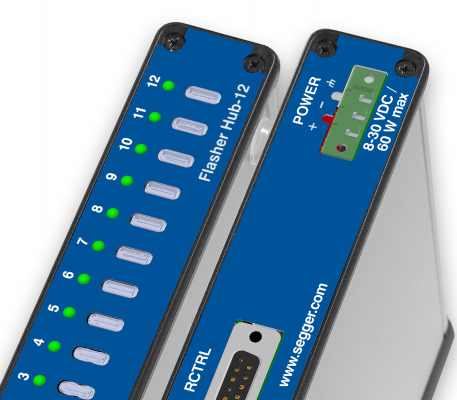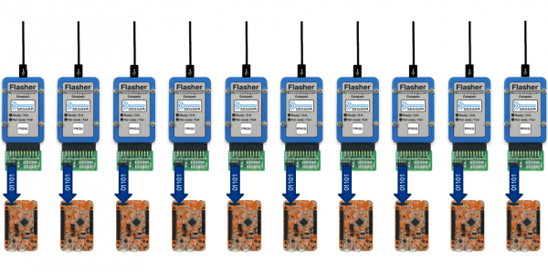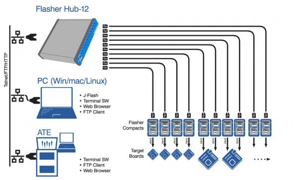 「Flasher Hub-12セットアップでは、各 Flasher Compact をターゲット デバイスのできるだけ近くに配置できます。Flasher Compact とターゲット デバイス間のケーブルを非常に短く保つことで、信頼性が最大化され、可能な限り最高の速度が保証されます。Flasher Compact はスリムで軽量な筐体により、スペース効率が高く、あらゆる生産環境に簡単に統合できます。筐体の設置面積はクレジット カードよりも小さいです。」と SEGGER のマーケティング マネージャーの Dirk Akemann 氏は述べています。Flasher Hub-12 は、接続された Flasher Compact の管理および制御システムとして機能します。Flasher Hub は、ハンドシェイク ライン、RS232、USB、または統合された Telnet、Web、または FTP サーバーを介して制御および監視できます。ギャング プログラミング システムによってプログラムされた各デバイスには、プログラミング中に個別のシリアル番号や MAC アドレスなどのパッチ、または個別の機能のライセンスを割り当てることができます。