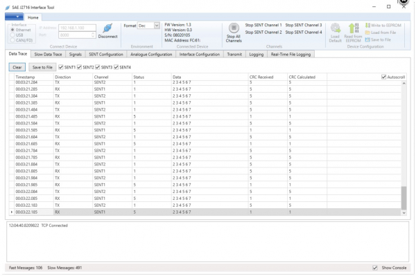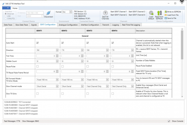 4 つの SAE J2716 (SENT) チャネルには、イーサネット / USB / CAN(/FD) 経由でアクセスできます。ユーザーは、Fast SENT メッセージと Slow SENT メッセージの両方を送受信できます。受信した SENT フレームを CAN(/FD) バスに自動的に転送するようにデバイスを設定できます。
