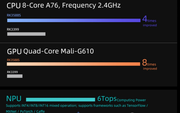 、主流の深層学習フレームワークをサポートします。強力な RK3588S は、さまざまな AIアプリケーション シナリオでより最適化されたパフォーマンスを提供します。