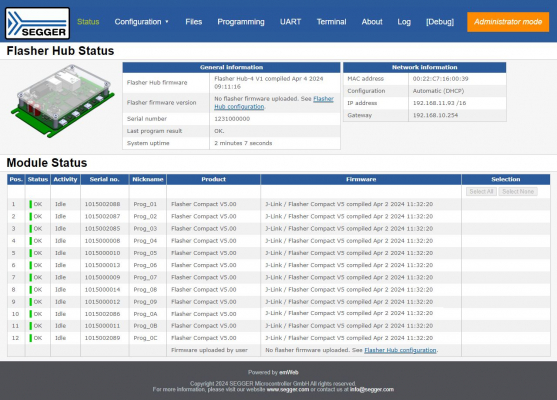 フレックスモードフレックスモードでは、フラッシャーハブ-4に4つ以上のモジュールを接続することができます。これは、SEGGER USBハブをFlasher Hub-4に接続することで実現できます。これにより、ユーザーはフラッシャーコンパクトにモジュールの位置を柔軟に割り当てることができます。最大24台のフラッシャーコンパクトモジュールを接続できるフラッシャーハブ-4は、拡張性の高いギャングプログラミングソリューションを提供します。