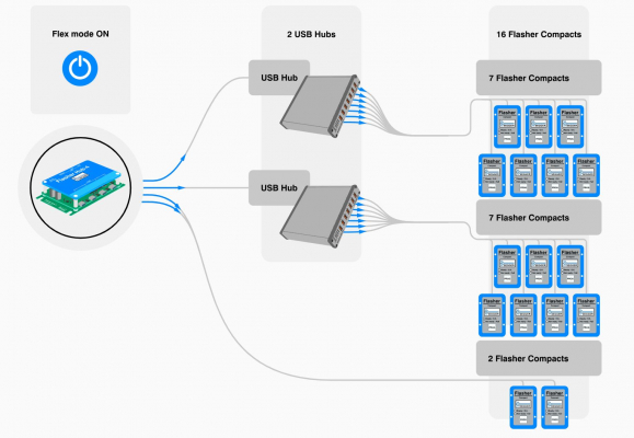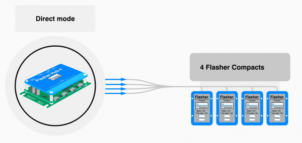 ダイレクトモードでは、接続されている各Flasher Compactモジュールには、USBポートに対応する位置が割り当てられます。このモードでは、最大4つのモジュールをシームレスに統合できます。