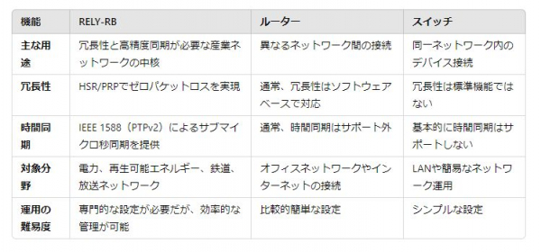RELY-RBは、ルーターや通常のスイッチとは異なる、高可用性ネットワーク専用の冗長性と同期機能を持つデバイスです。特に、ミッションクリティカルな産業用ネットワークでの使用を想定しています。 RELY-RBは、これらの課題を完全に解決する設計となっており、長期的な信頼性とコスト効率を提供します。