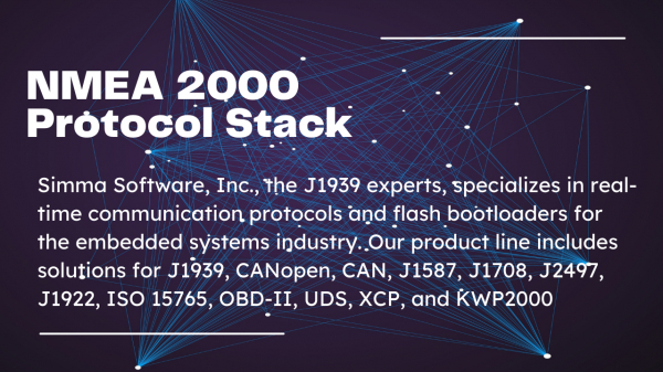 NMEA 2000プロトコルスタックを提供いたします。本ソフトウェアは、米国でCAN(Controller Area Network)の専門家として広く認知されているSimma Softwareによって設計され、高速なCAN通信の厳しい要求に応えるために開発されました。NMEA 2000ソースコードは高性能なモジュラー設計を採用し、シンプルなAPIを提供します。ベンチマークテストでは、他の市販のNMEA 2000ソフトウェアソリューションと比較して800%効率的であることが証明されています。また、このソフトウェアは詳細なドキュメントが用意されており、25万を超える組み込みシステムで採用されています。