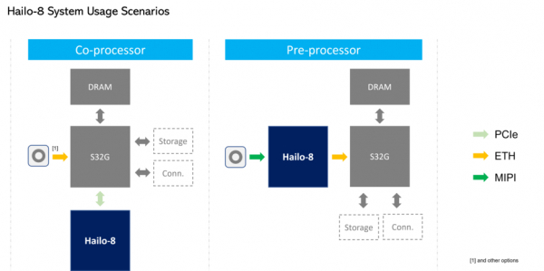 S32G を使用すると、たとえば、MIPI カメラ インターフェイスを介して接続されたカメラのスマート プリプロセッサとして Hailo を使用できます。Hailo-8には独自のオンチップ メモリがあるため、計算は非常に効率的で高速です。