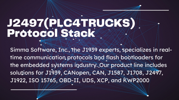シンマソフトウェア(Simma Software, Inc.)は、アメリカ合衆国インディアナ州西端、ビーゴ郡に位置する都市テレホートに本社を置いています。自動車業界向けのJ1708、UDSプロトコルスタック、J1939インタフェースオプションなど、セーフティクリティカルなリアルタイム組込みソフトウェア開発を専門としています。製品ラインには、J1939、CANopen、CAN、J1587、J1708、J2497、J1922、ISO 15765、OBD-II、UDS、およびKWP2000用のソリューションが含まれています。ソフトウェアは、100万台以上の電子制御ユニット、110の設計、100以上のお客様に使用されています。当社の製品は、フォード、ボーイング、米軍、すべての主要OEM(フレイトライナー、インターナショナルなど)のいくつかのティアワンサプライヤー、いくつかのセルラー機器プロバイダー、および診断機器メーカーによって使用されています。