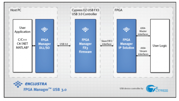 ホスト・ソフトウェア・ライブラリ(DLL)、サイプレスのEZ-USBのファームウェア含ま® FX3の™の USB 3.0デバイスコントローラ及びFPGAに適したIPコアを。ユーザーホストアプリケーションは、基本的なプロトコルの複雑さを隠す単純な読み取り/書き込みデータコマンドで構成される単純なAPIを介してFPGAと通信できます。ストリーミングとメモリマップされたアクセスがサポートされています。