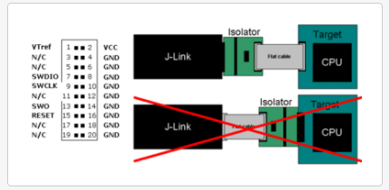 J-Link SWDアイソレータは、J-Link / Flasherとターゲットハードウェアの間に接続して、電気的絶縁を提供することができます。