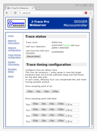 IP-over-USB技術を組み込みのWebサーバーと組み合わせて使用​​すると、デバイス名をWebブラウザに入力するだけで、任意のホスト(Windows、Linux、Mac)からデバイスに簡単にアクセスできます。デフォルトのデバイス名はusb.localです。シリアル番号を追加することができます。複数のデバイス名(シリアル番号の有無にかかわらず)を割り当てることもできます。 エンドユーザ は以前よりも簡単にデバイスにアクセスできます。セットアッププログラムなし、ドライバなし、特別な知識は必要ありません。それは単に機能します!この技術は、あらゆるUSBデバイスですぐに利用でき、ユーザーフレンドリーにすることで多くの価値を付加します。ユニットのキーやディスプレイが不要です。この目的のためにどんなPCも使用できます。左側には、SEGGER J-Trace PROに接続されたWebブラウザのスクリーンショットがあります。表示されたページは、トレース取得タイミングを調整すると同時に、このタイミングに基づいてトレース解析の結果をリアルタイムで視覚化し、トレース取得タイミングを調整する際に非常に便利です。