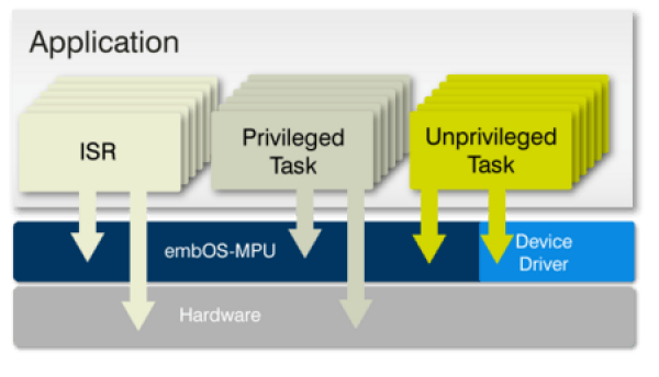 既定では、新しく作成された特権のないタスクはRAMとROMへの読み取りアクセスを持ち、書き込みアクセスは独自のタスクスタックに制限されていますが、RAMとROMでコードを実行できます。周辺機器にアクセスするために、追加のメモリロケーションとOS制御構造、デバイスドライバ、特定のembOS APIが特権のないタスクから呼び出されることがあります。