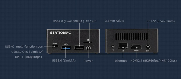 HDMI 2.1 (8K@60fps)、DP1.4 (8K@30fps) を含む 2 つの映像出力、1 つのギガビットイーサネットポート、USB3.1、USB2.0、3.5mm オーディオジャックを搭載。多様な用途に対応可能な豊富なポート構成。