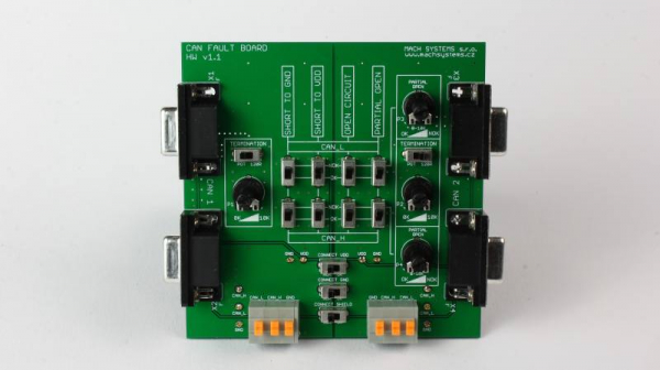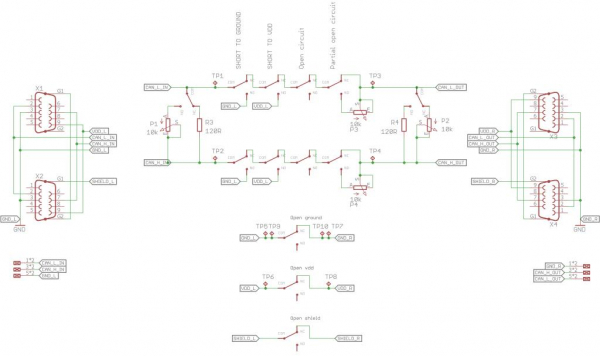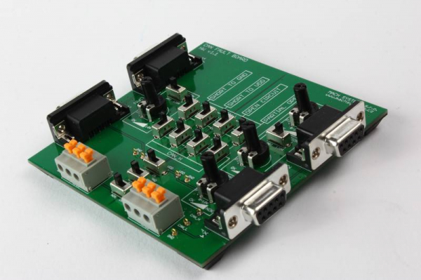 ◆特長Bus Fault Injection Boardは、左側と右側の2つのセクションに分かれており、各側に1:1で結線されたD-SUB9Fコネクタを備えています。これらの間にフォルトインジェクション用のスイッチが配置されており、すべてのスイッチを「OK」位置に設定すると、物理層にエラーは発生せず、左右のセクションは正しく接続されます。そのため、本ボードはネットワークデバイス間の通常接続にも使用可能です。