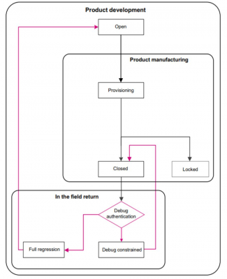 1.CMでOBKeysアルゴリズム選択 → 2) SPでProvision状態へ → 3) .OBKをPMで投入 → 4) Verify → 5) DPでHDPL0 OBKeysへ供給 → 6) SCでClosed状態へ遷移。以降はAllow Regressionとパスワード指定、Mass erase upon connectionを有効化して再接続
