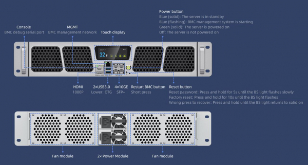 ・ 運用管理:aBMC(Web UI/CLI/Redfish)による監視・設定・アラート・リモート保守、タッチパネルで温度・ファン・電力・IP等をリアルタイム表示