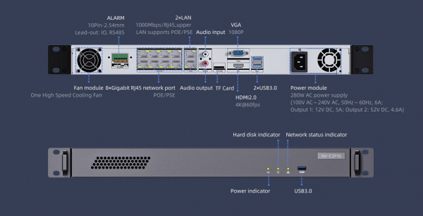 ・ I/Oとネットワーク:8×GbE(RJ45/PoE-PSE)+2×LAN、USB3.0×3、VGA/HDMI2.0(4K@60)、ALARM端子(RS485/IO)を装備