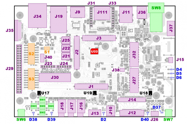 ・ J21/J22/J23/J24/J25/J27/J29/J30/J31/J32/J33/J34/J35/J36/J37/J38:UART/JTAG/CAN(MIKROE-3060)/I⊃2;C+GPIO/CSI1(iPass)/CSI2(FFC)/DCジャック/端子台/CPUファン など