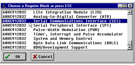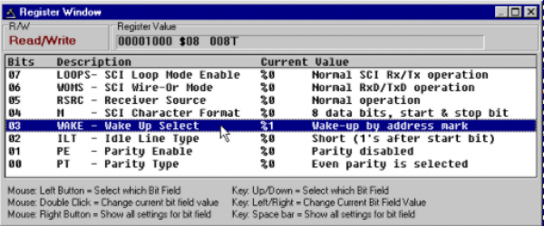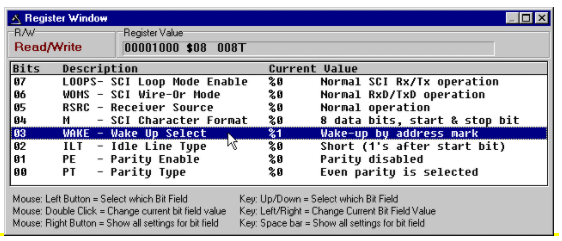 EG12は、NXPの68HC12レジスタのシンボリックビットフィールドデバッグを追加します。現在のレジスタファイルがデバイスから読み込まれ、記号的および数値的に表示され、変更された値がデバイスに書き戻されます。