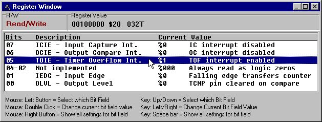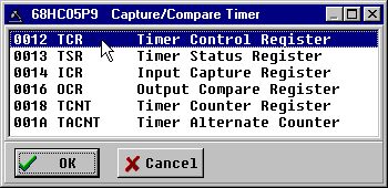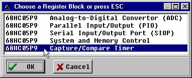 Rコマンドを使用すると、レジスタとレジスタのフィールドをシンボリックと数値の両方の形式で表示および変更できます。Rコマンドを入力すると、拡張子が.REG(REGISTERファイル)のファイルのメインプログラムを含むディレクトリが検索されます。これらのファイルのそれぞれは、レジスタのブロックを記述する。ピック・ウィンドウにブロック名(.regの1行目)ファイルが表示されます。レジスタブロックを選択すると、そのブロック内の各レジスタには、アドレス、名前、説明がピックウィンドウに表示されます。レジスタを選択すると、現在の値がデバイスから読み込まれ、記号と数値の両方で表示されます。その後、レジスタの内容を編集することができます。